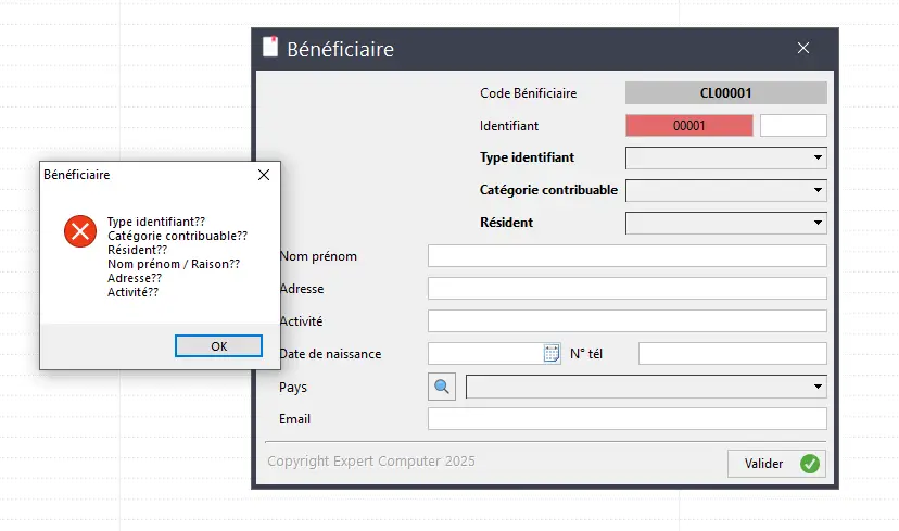Le logiciel TEJ intègre un système de contrôle intelligent de la saisie afin de garantir la conformité des informations enregistrées. Lorsqu’une donnée est incorrecte, incomplète ou incohérente avec les règles fiscales imposées par la plateforme TEJ du ministère des Finances, le champ concerné est automatiquement mis en surbrillance rouge pour alerter l’utilisateur. Ce mécanisme empêche la validation tant que l’erreur n’est pas corrigée, évitant ainsi les rejets lors de l’exportation XML ou le dépôt final sur TEJ. Grâce à ce système de vérification en temps réel, les utilisateurs réduisent considérablement les risques d’erreur et gagnent en fiabilité dans le traitement de leurs certificats de retenue à la source.
