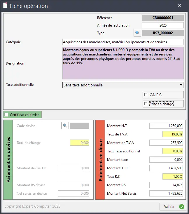 Le logiciel TEJ propose une fiche de saisie d’opération claire et guidée, intégrée directement au sein de chaque certificat de retenue à la source. Lors de la saisie, l’utilisateur bénéficie d’une assistance dynamique : les montants sont calculés en temps réel en fonction des taux appliqués, avec affichage immédiat du résultat. Cette automatisation permet de vérifier la cohérence des données saisies, d’éviter les erreurs de calcul manuel, et de visualiser instantanément l’impact sur le certificat. Conçue pour maximiser la transparence et la productivité, cette fonctionnalité garantit une saisie rapide, précise et conforme aux normes de la plateforme TEJ du ministère des Finances tunisien.