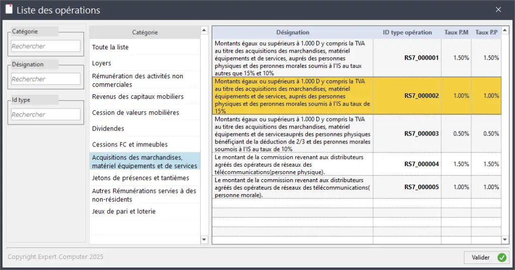 Le logiciel TEJ affiche un tableau structuré des opérations liées aux certificats de retenue à la source. Chaque ligne présente la désignation, l’identifiant, ainsi que les taux de retenue pour personnes physiques et morales. Grâce à la recherche par colonne, l’utilisateur peut facilement filtrer et sélectionner l’opération appropriée. Cette vue claire et catégorisée assure une saisie rapide, fiable et conforme aux exigences de la plateforme TEJ.